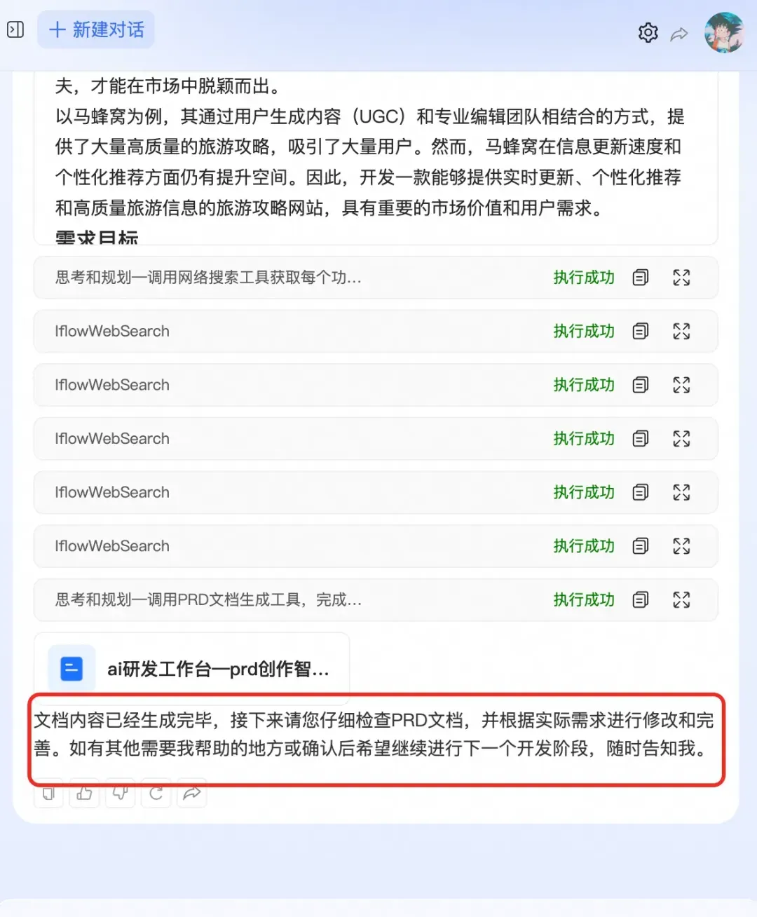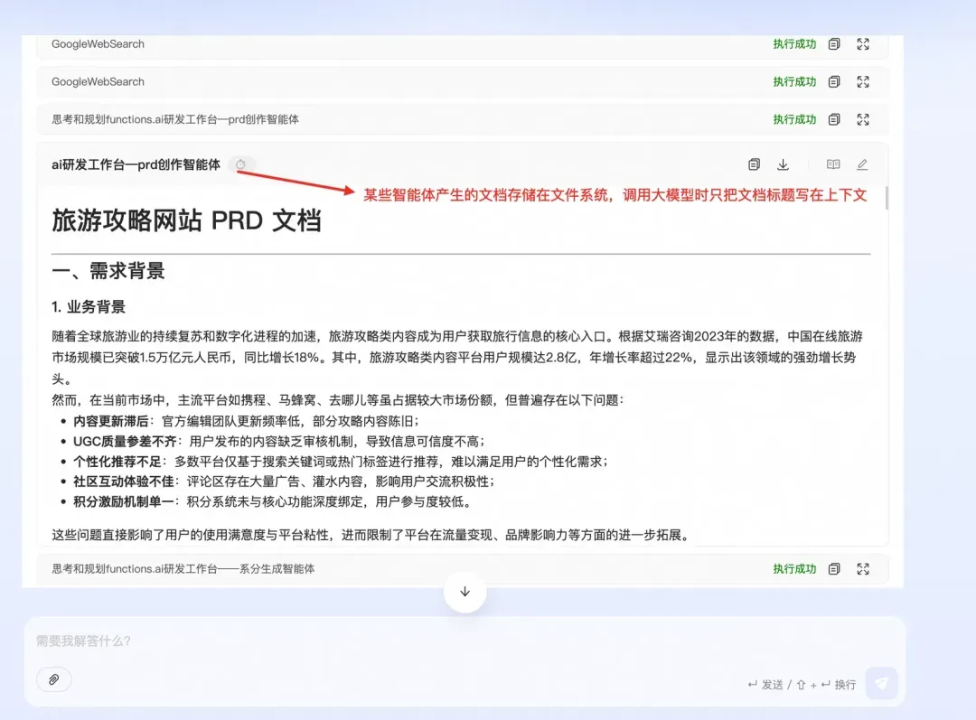 不使用总结工具的输出如下,最终生成的内容只是“xxx已经生成完毕,如有xxxx随时告诉我”,用户需要爬楼去找真正输出xxx文档的那一步的结果。