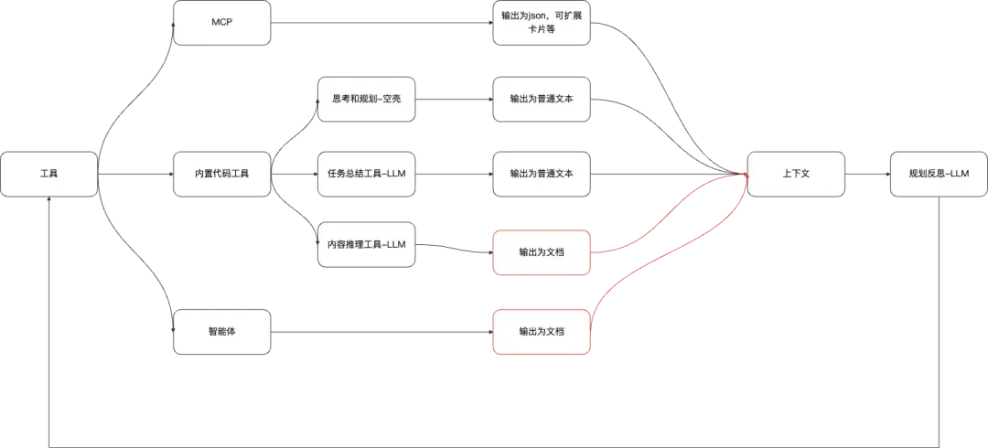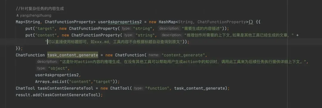 1.定义了一些特殊的文本生成工具,背后实际是单独的大模型调用,如创作类助理场景,生成PRD、生成系分等;
