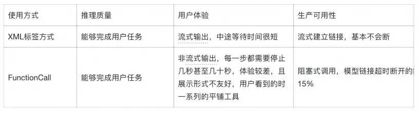 为了尽可能减少用户等待下一次返回的工具名和入参,必须用流式效果将TooCalls的调用过程展示,且避免使用functionCall的流式。因此我们采用了让大模型返回 XML标签的方式来获取工具名和入参,并且为了在返回工具名之前能让用户能感知模型在推理,我们提示大模型在 返回XML标签的同时生成思考过程 ,将思考过程流式展示给用户,相当于是将思考规划步骤和工具推理步骤合并 。