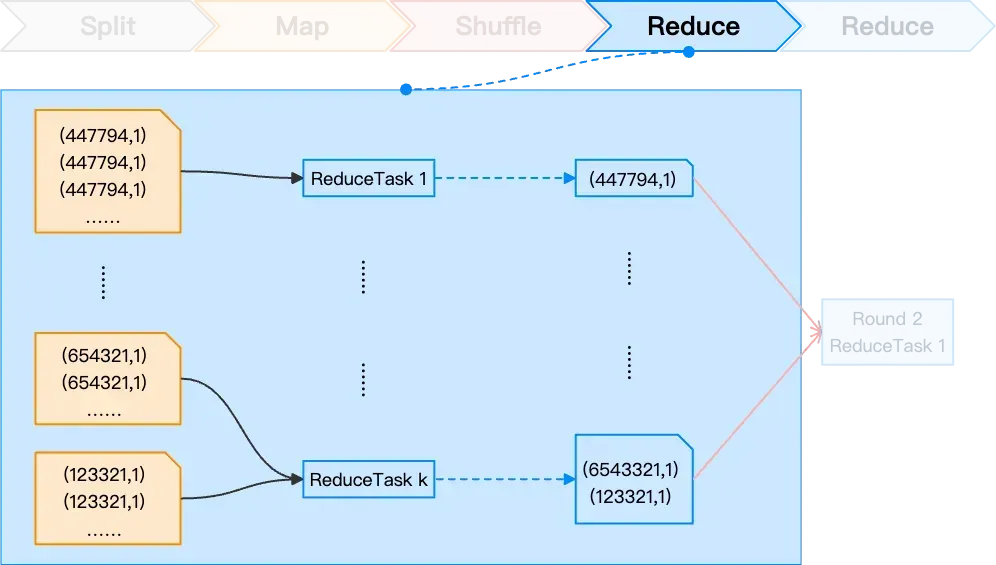 在本例中,相同的visitor_id会被Shuffle到同一个ReduceTask内,由于我们的聚合逻辑是计算UV,因此每个ReduceTask只需要计算其一共需要负责多少个Key并输出即可。
