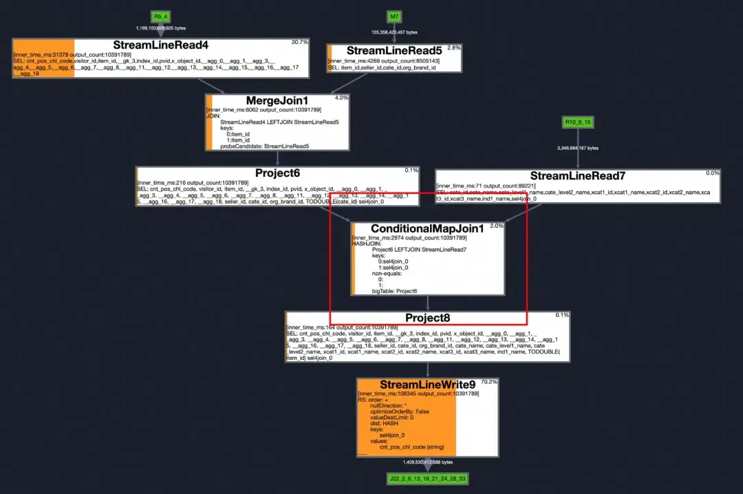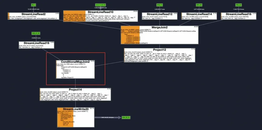 可以看到,ODPS自动为我们增加了一个ConditionalMapJoin环节,也就是ODPS识别到cate_id和taggingV5_cate对应的两张从表体量较小,可以根据实际调度情况尝试自动优化为MapJoin提升任务执行速度。那么看到这里就引出了另一个问题:既然cate_id和taggingV5_cate这两个Key的从表已经自动转变为了MapJoin,剩下的JOIN Key都是item_id为什么还会需要2个JOIN阶段呢?这也就引出了本案例想要指出的核心观点:编写JOIN顺序以及应用合适的JOIN方式十分重要。
