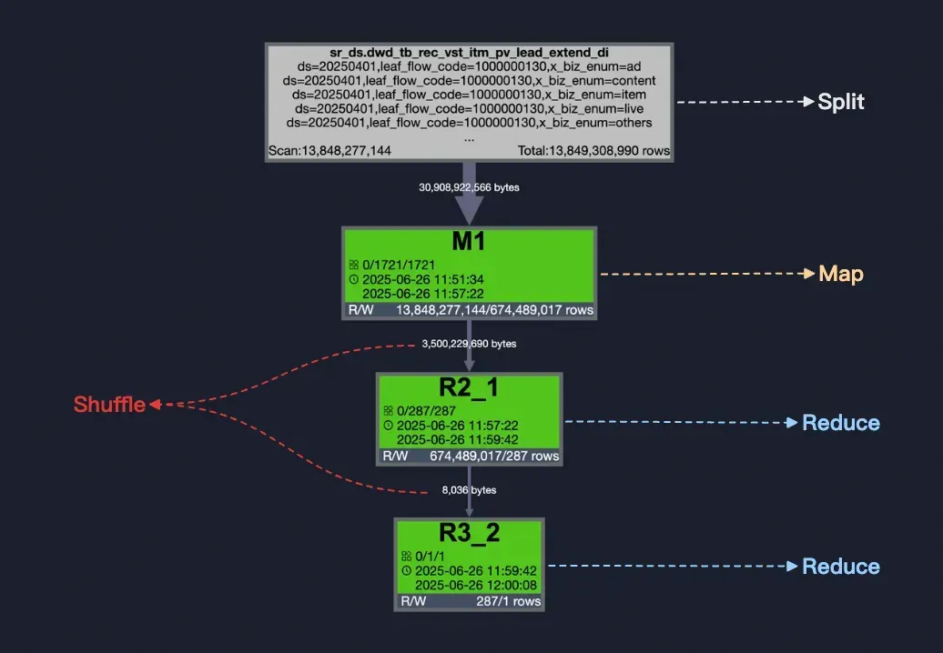 本例中,表sr_ds.dwd_tb_rec_vst_itm_pv_lead_di中对应ds = '20250401'、leaf_flow_code IN ('1000000130')并且x_biz_enum NOT IN ('sjgg')的分区就会被选中并Split。