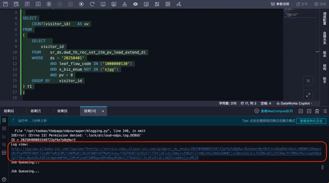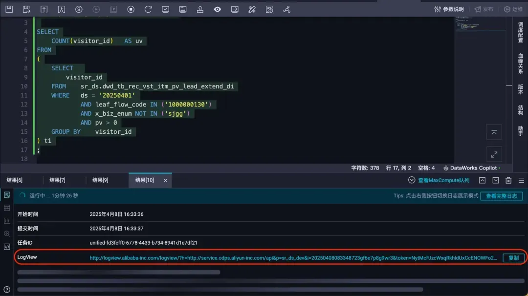 当我们在DatasStudio运行了一个SQL任务之后,日志展示中都会有如下图所示的一个Logview入口链接: