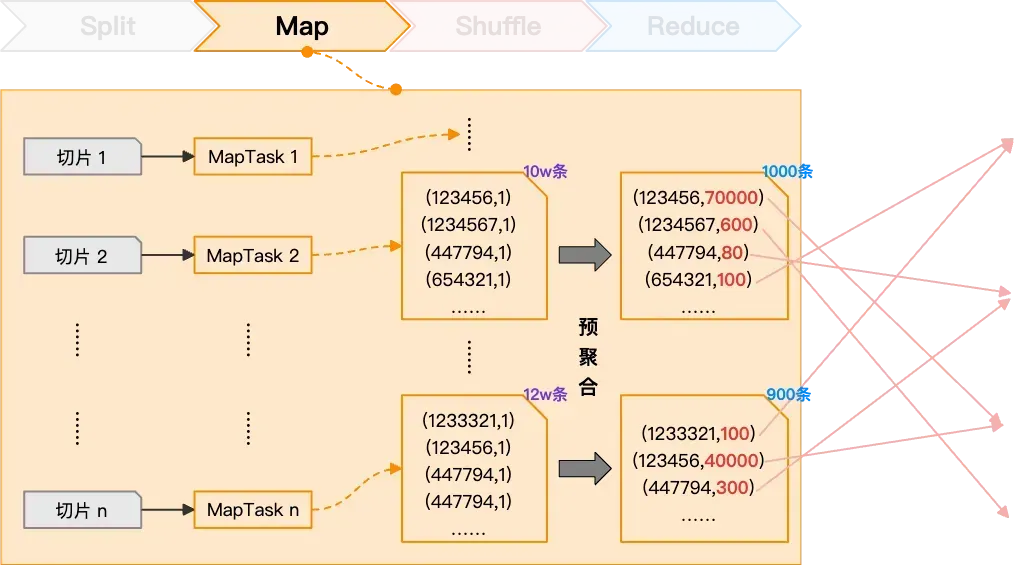 就本例而言,Map阶段处理工作较为简单,只需要针对每部分切片数据,取出对应visitor_id列的数据作为Key,将数字“1”作为Value,然后将两者组成为键值对输出即可,例如:(447794,1),(123456,1)……