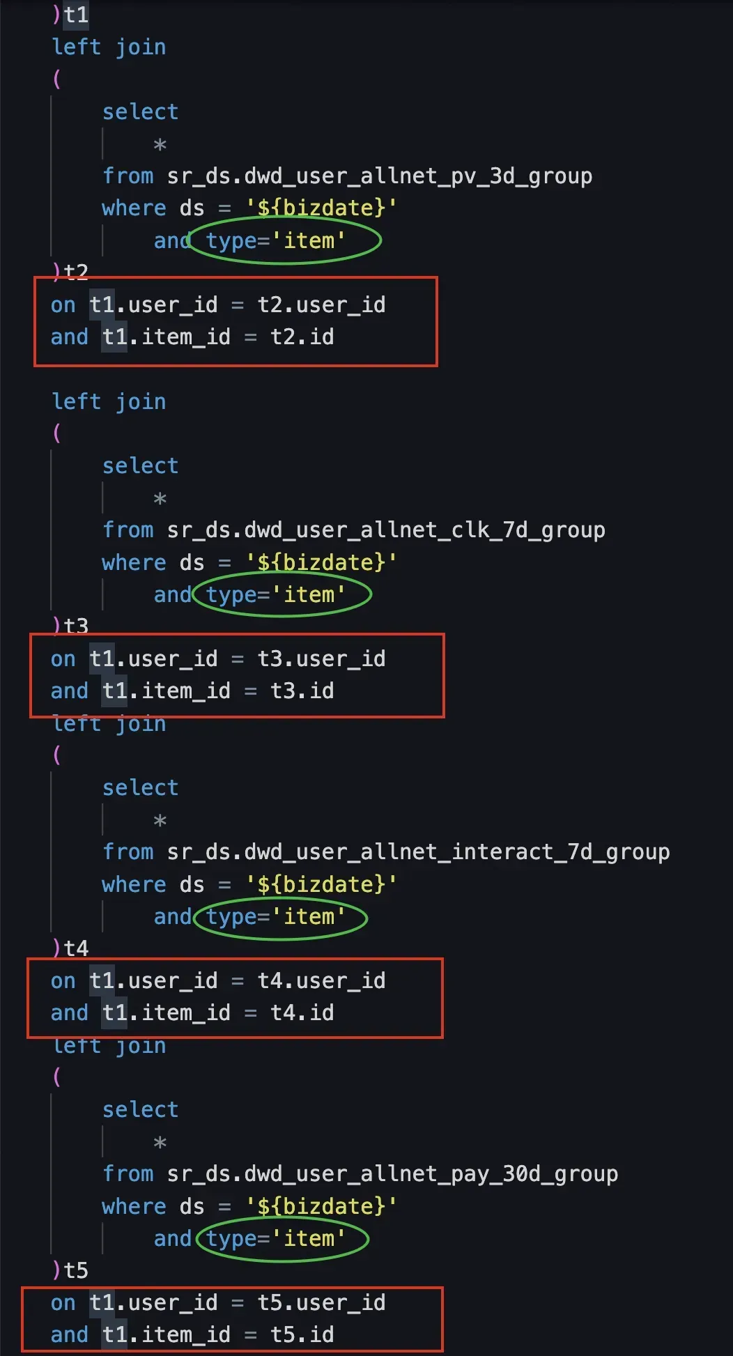 可以看到DAG图中一共有8个JOIN节点,说明有8个不同的JOIN Key,也就是对应上述`type`字段的8个枚举值过滤条件,而在代码中我们可以简单任选一段JOIN来看: