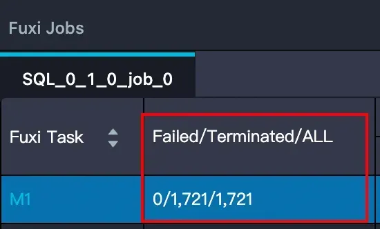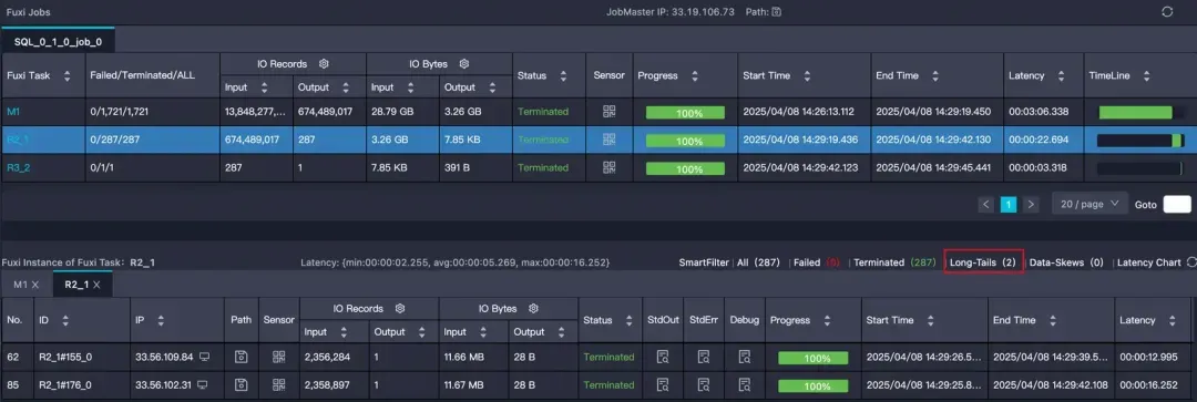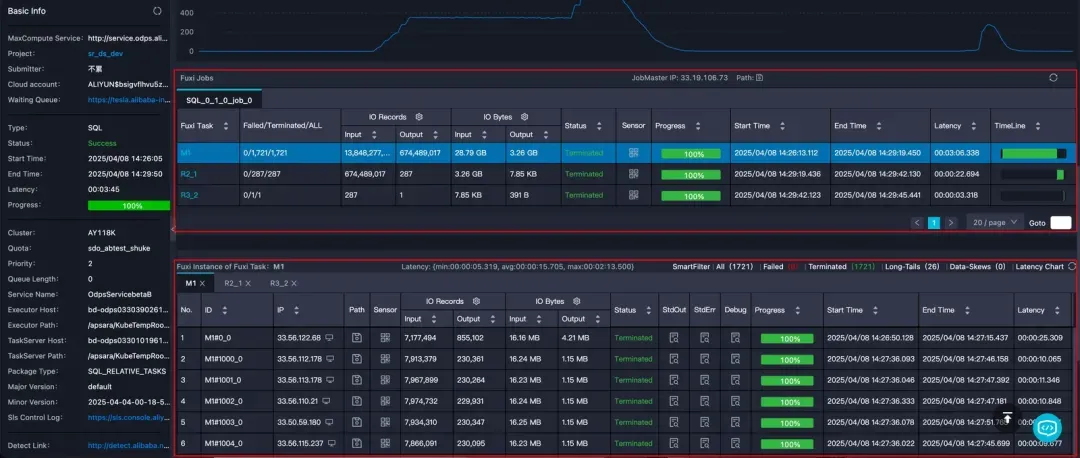 “R2_1”和“R3_2”稍有不同,前缀“R2”和“R3”分别表示这是第二个和第三个实例任务阶段,且均是Reduce任务,而后面紧跟的“_1”和“_2”则分别表示该阶段任务依赖于第一和第二个实例任务阶段,只有在依赖的实例任务阶段完全结束后本实例任务阶段才能开始,即“R2_1”要等待“M1”结束后才能开始,“R3_2”要等待“R2_1”结束后才能开始。同样地,R/W表示该阶段读入和写出的总行数统计,并且可以看见“R2_1”一共有287个ReduceTask实例,“R3_2”只有1个ReduceTask实例;
