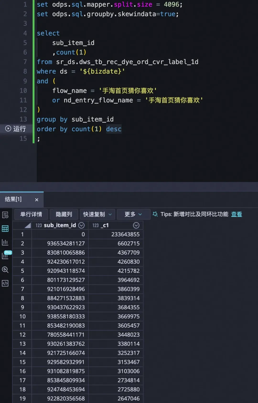 那么根据DAG图所示的现象,我们就可以快速反向定位到代码中的问题片段,由于MapJoin是不会有如此显著的倾斜问题的,所以倾斜现象大概率是在JOIN表C时造成的,即主表的item_id字段有倾斜。为了验证这一猜想,我们可以针对主表的item_id进行数据分布探查,看看占比最多的item_id都有哪些就一目了然了,探查sql和结果如下: