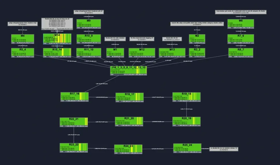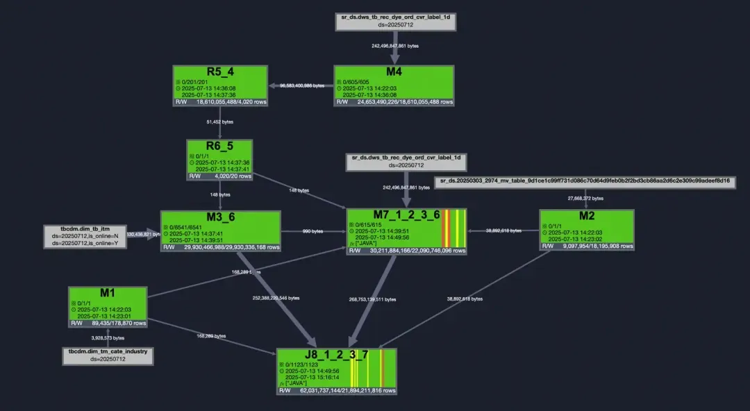 然而,这样不设分区全表扫描导致的问题就到此为止了吗?当这个作业的下游逐渐增多,越多越多的业务需要接入,这个时候对作业的产出实效和稳定性要求也会愈发苛刻,而由于底表未分区这种底层建设问题所引发的未来优化成本将会是十分高昂的。仍然以上述SQL作业为例,现在因时效问题我们需要对其进行优化改进,因此必须结合其运行实例过程进行分析然后制定优化策略,但光靠看上述DAG图我们压根无法快速得出每部分JOIN的从表体量分别有多大,即便费尽力气将1天的从表体量计算出来,也不能只依据这一天的数据就设定优化策略,还需要以这样的方式计算多天得到较为明确的数据体量分布,效率极其低下,几乎不可能以这种方式实现。这时候如果底表建设时考虑周全设定了分区,我们就只需要通过数据地图查看每日分区产出信息就能很快速地制定大方向上的优化策略,暂且不说效率上提升多少,这件事也从“不行”瞬间变为了“可行”。然而,如果现在痛定思痛决定去进行底表改造,不仅需要提前沟通上下游做好数据备份,还需要回刷数据调整调度依赖,徒增工时。