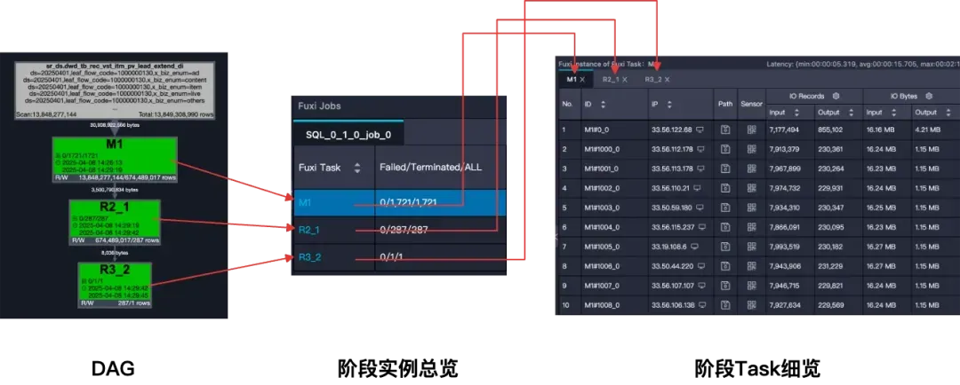 图中红色方框框住的两个主要部分需要重点关注,第一个框“Fuxi Jobs”即为上文所述的实例任务阶段总览,即Map和Reduce阶段的实例总览,展示的信息包括该阶段的总读入/输出行数及文件大小、运行状态、运行时长等等;第二个框“Fuxi Instance of Fuxi Task”中的内容即为每个实例阶段内各个Task详细信息展示,也就是各个“驿卒”的工作状态,当我们点击DAG图或者“Fuxi Jobs”中的不同阶段,本部分对应的Task信息也会跟随变化,例如可以看到现在点击的是“M1”阶段,则各个Task即为Maptask,展示的信息内容和总览类似。下图展示了任务具体信息区域内三个大模块的对应关系: