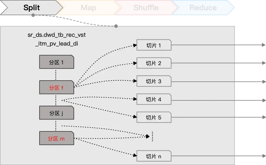 众所周知,我们的表存储会按照建表时设置的分区字段“分块”存储,因此只有在SQL的WHERE条件中过滤了的分区才会被选中并进行Split切片。这部分被选择的分区随后会按照一定规则被切分成n份“逻辑”切片数据(并非真的物理切分),以供Map阶段进行分布式处理。