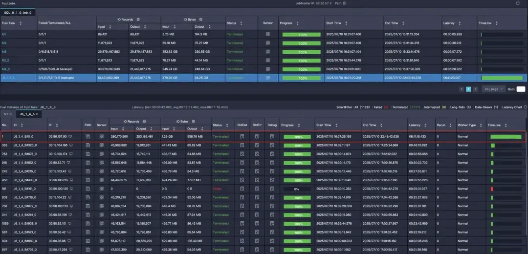 由于本例中MR流程已经全部执行结束,因此Map和Reduce方框都是绿色,否则可能有其他颜色表示当前状态。不难看出,上述DAG图所展现的MR总体流程其实和我们在1.2章节中分析的近乎一致,“R2_1”就是第一次Reduce,“R3_2”即为第二次Reduce。搞懂了上述DAG图的基本含义,现在我们已经可以慢慢分析更复杂的任务了,但是仅仅靠DAG图内的这些信息我们仍无法得知当前SQL是否存在倾斜问题,因此需要深入每一阶段的Task实例进行分析。