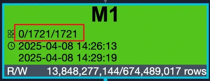 “M1”方框则表示这是本次MR流程的第一个实例任务阶段:Map阶段,可以看见一共有1721个MapTask实例,R/W表示该阶段读入和写出的总行数统计;