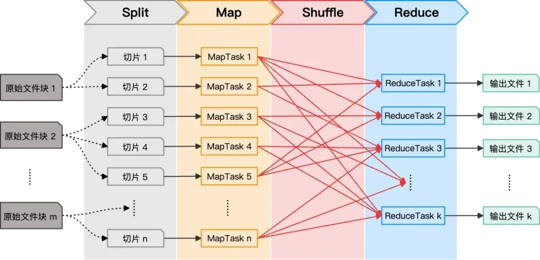 剩下Map和Reduce以及Reduce和Reduce之间的箭头自然就是Shuffle阶段了。