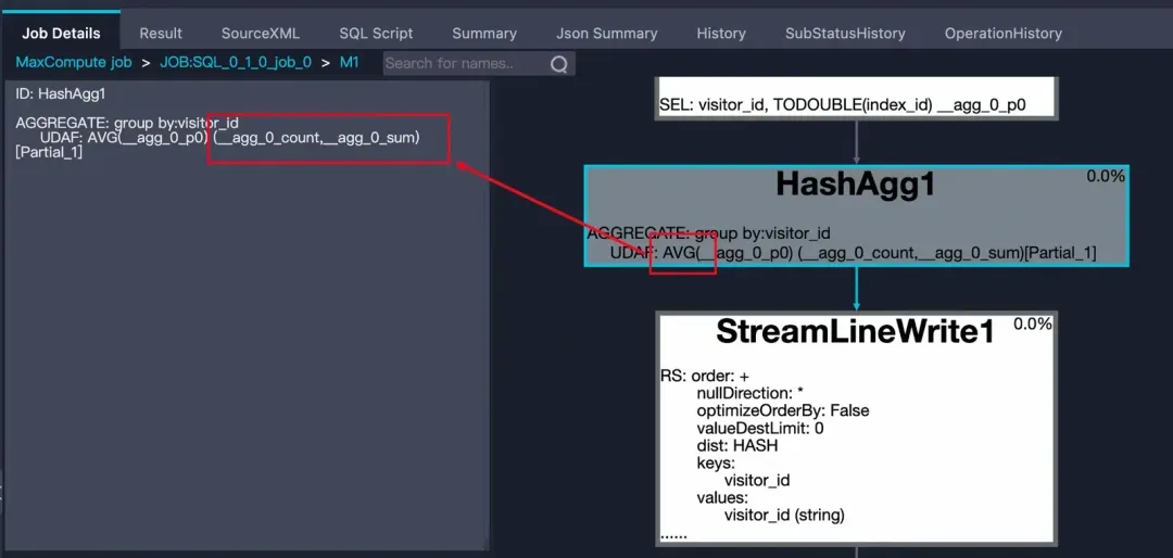 继续单击尾部的“StreamLineWrite”流程,可以看到上图中左侧所示的细节参数信息,其中红框所示的信息是我们需要重点关注的,即keys和partitions,因为这就是Shuffle的具体依据,可以看到在此例中visitor_id即为导致数据倾斜的Key,那么结合我们的SQL代码也就可以判断出“GROUP BY visitor_id”即为问题根源。关于数据倾斜,其本质是一个大类问题,具体到GROUP BY和JOIN各自还有多种问题场景及对应解决方案,这些都会在第三章详细展开,读者在此只需要能够借助Logview等方式判断代码问题位置即可。
