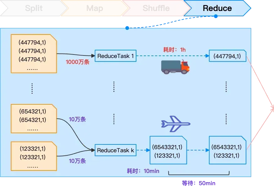 仍然以上文的计算手淘推荐大盘曝光UV指标为例,在Map阶段结束后每一条数据都会以Key-Value形式输出,每条数据被Shuffle到哪一个ReduceTask根据Key来决定。这里的Key自然就是visitor_id,那么很显然,如果有某一部分特殊高频用户(如爬虫账号、测试账号)产生海量行为日志,又或者有大量visitor_id为NULL的脏数据,那么这些visitor_id对应的数据都会分配到对应的一个ReduceTask,而其他的ReduceTask负责的都是正常用户,这里的处理数据量级的差距就可能有几十甚至上百上千倍,大部分正常的ReduceTask十几分钟就处理完毕,却要一起等待倾斜的Task可能数小时,也就出现了严重的数据倾斜。
