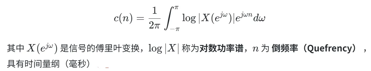 - 倒谱(Cepstrum):信号功率谱对数的傅里叶逆变换(IDFT),数学表达式为: