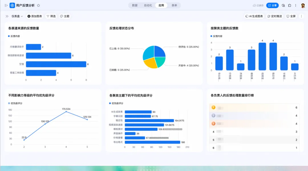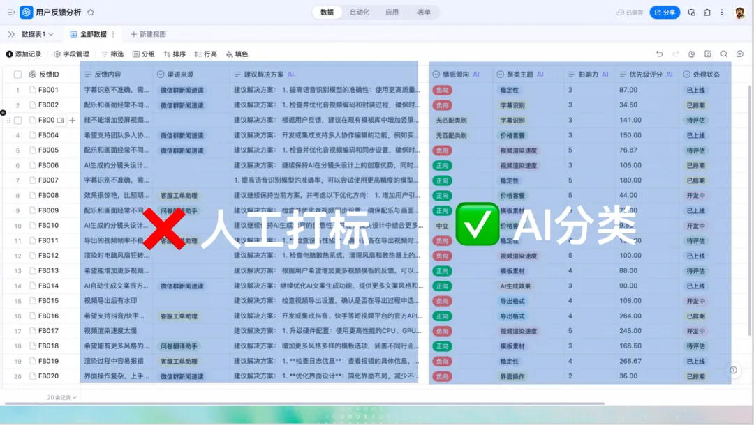 现在,我把这些大批量的用户反馈放进钉钉AI表格。现在 AI 表格会自动帮我聚类,提炼观点,再生成一份数据看板。