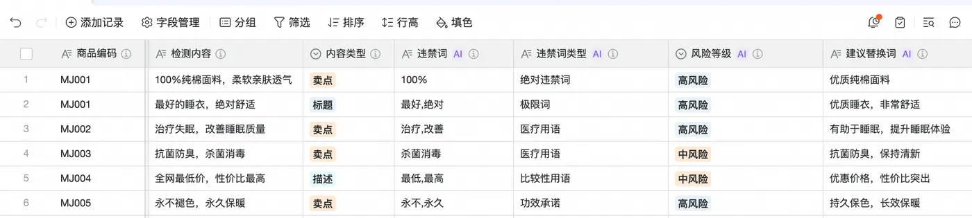 违禁词检测(进阶) 痛点:人工审核成本高、容易遗漏,高风险词一旦出现,商品可能被下架。 解决方案:Workflow自动检测文案,与平台违禁词库对照并标记高风险词,表格中自动给出建议改进方案。