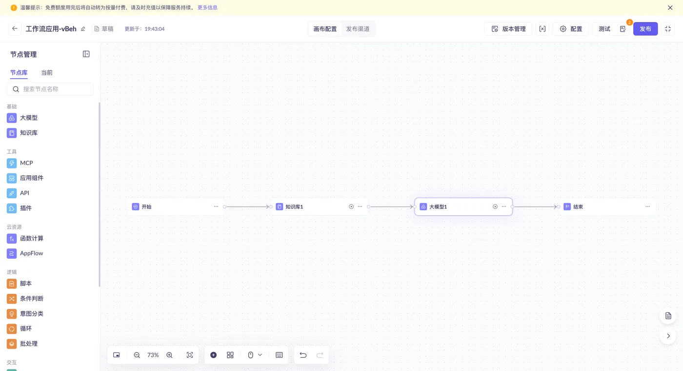阿里云百炼工作流提供了一个可视化画布,让用户可以像“拼积木”一样,通过拖拽和组合原子化节点(如大模型节点、知识库节点等)来完成业务流程设计和调试,实现逻辑搭建和效果验证的“所见即所得”。