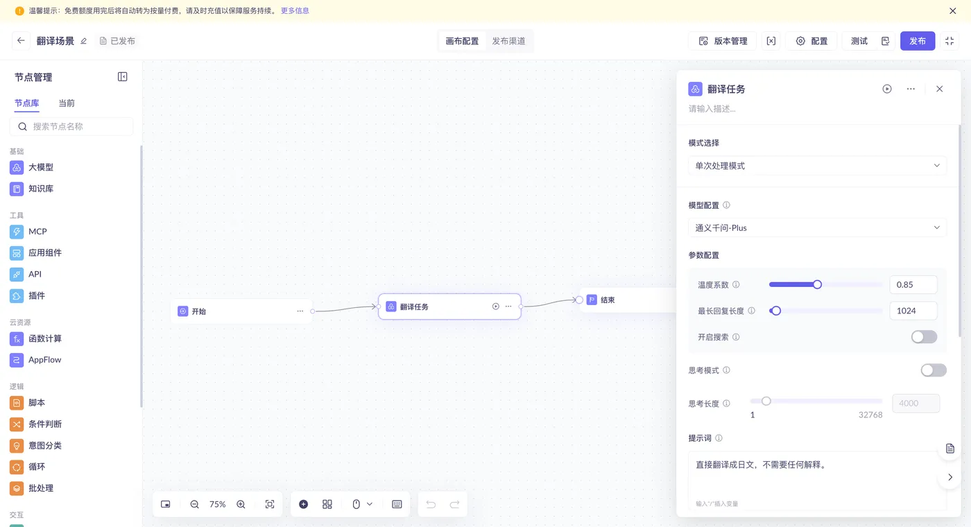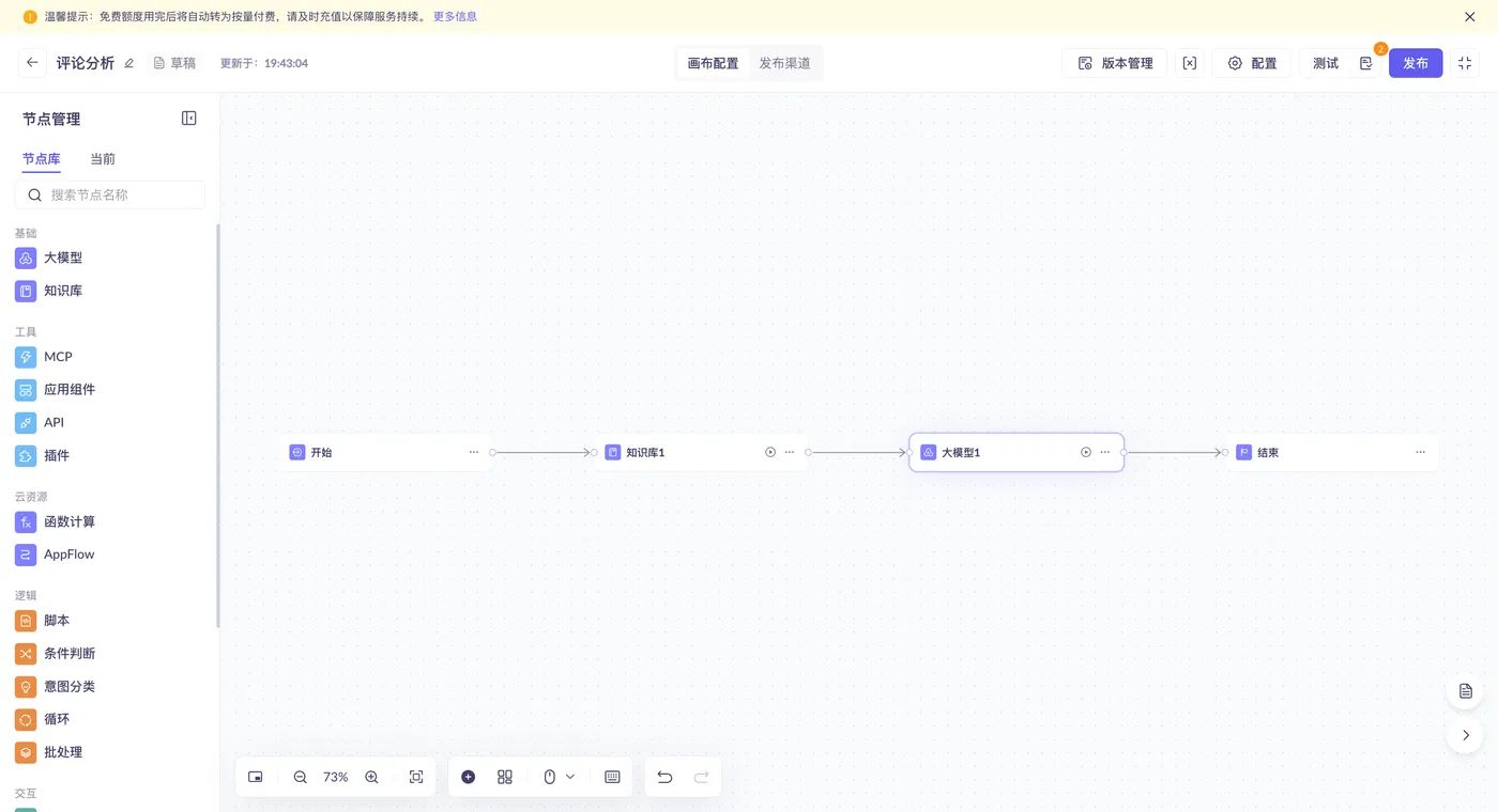 - 在电商业务中,你可以轻松把翻译节点、评论分析节点、违禁词检测节点、知识库问答节点串联起来,让流程一次跑通;