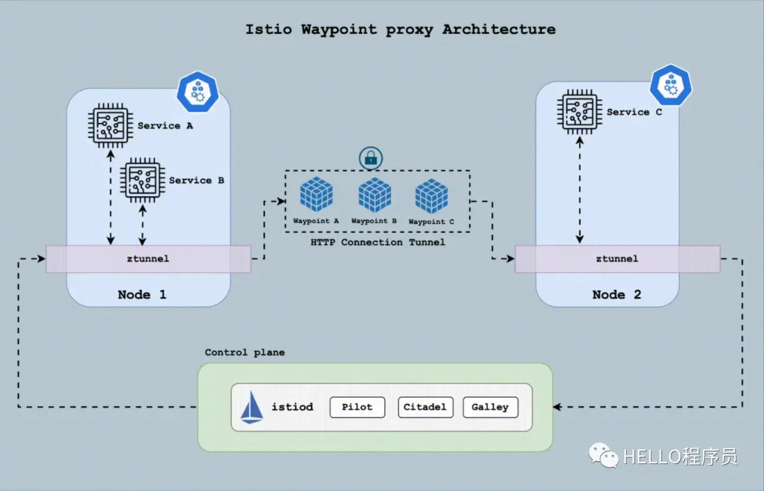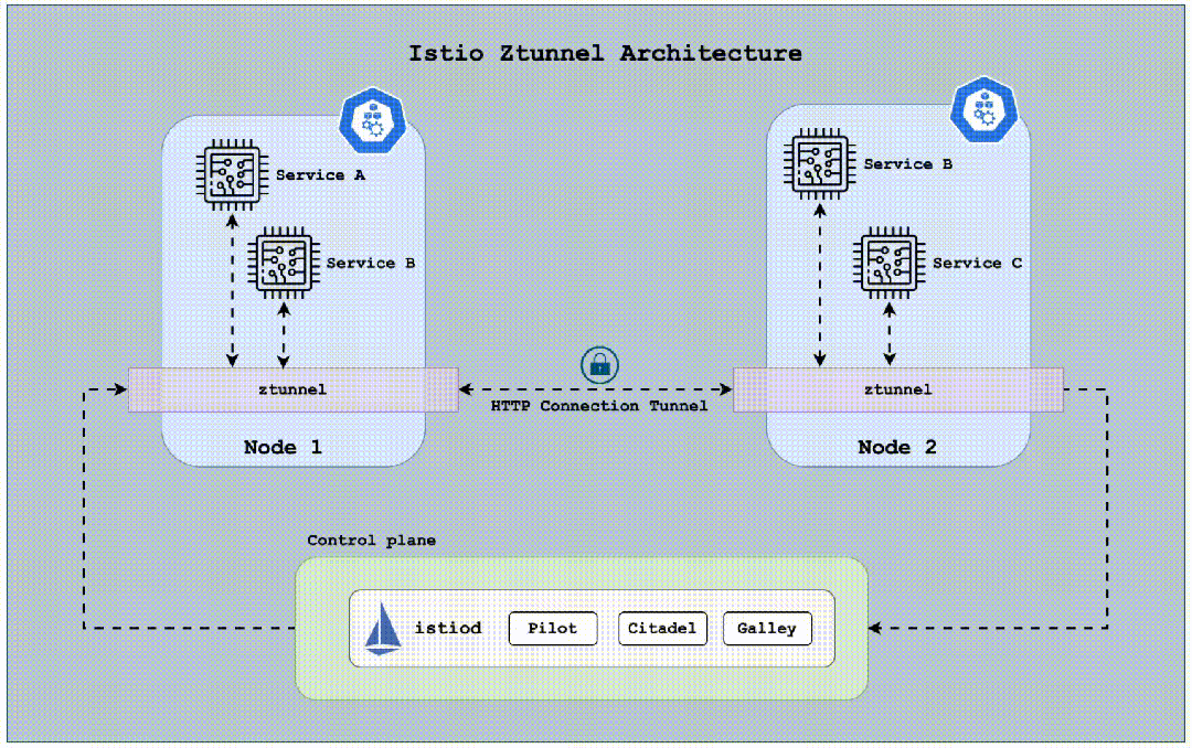 - Kubernetes 集群中的每个节点上都有一个共享代理 (ztunnel),负责网格内的安全连接。