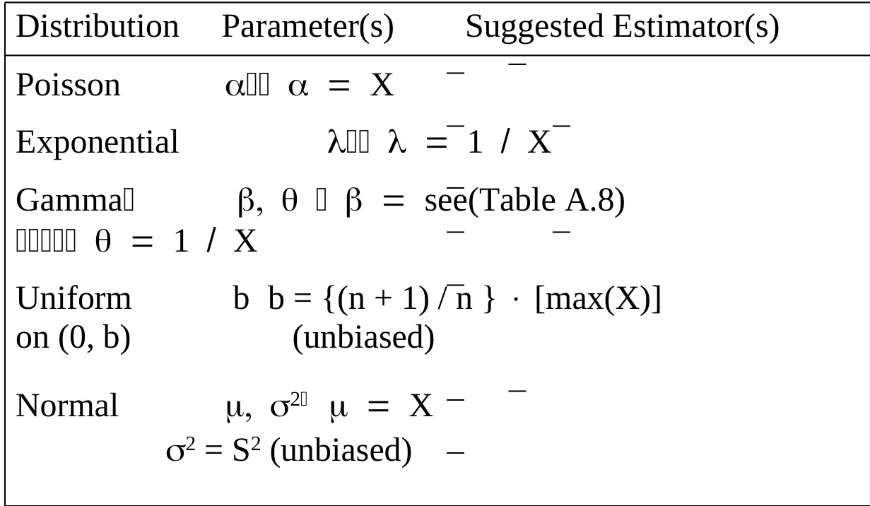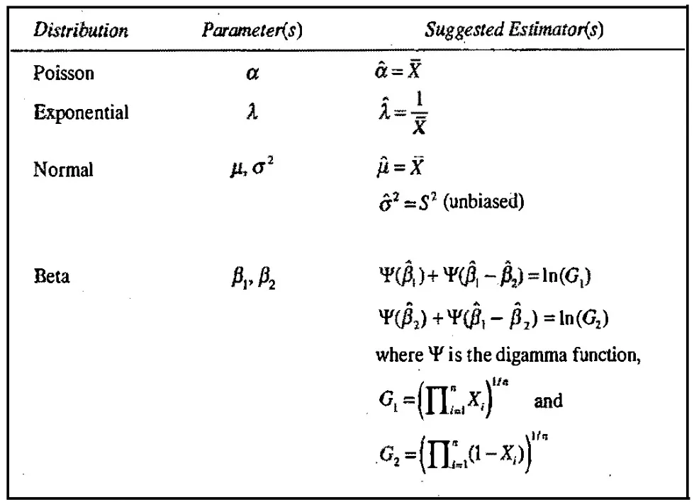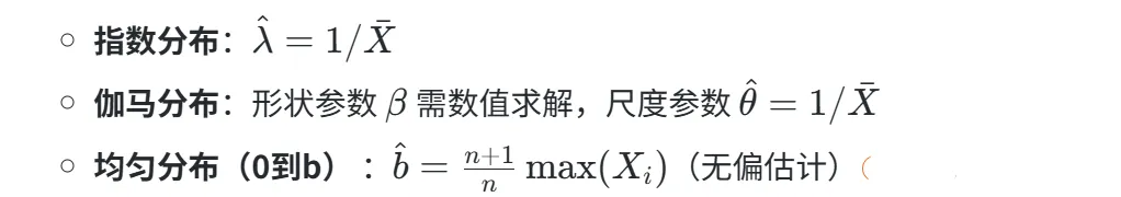 - 正态分布:μ^=Xˉμ^=Xˉ, σ^2=S2σ^2=S2(无偏估计)。