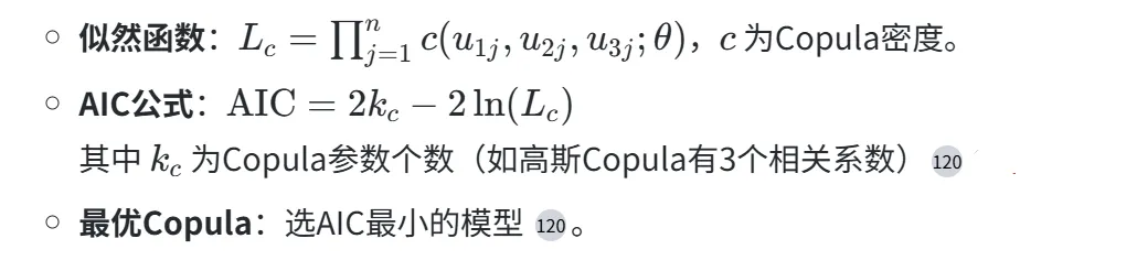 其中 Fi 为最优边缘分布 。 - 候选Copula拟合 拟合常见Copula族(如高斯、t、Clayton、Gumbel、Frank),估计参数: