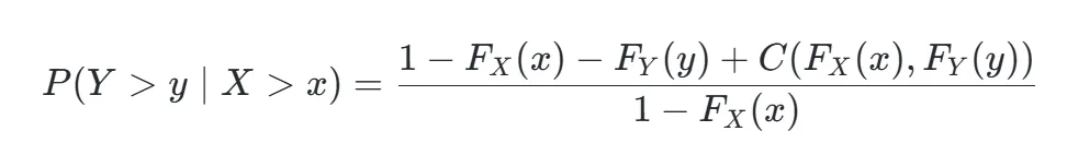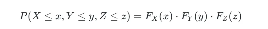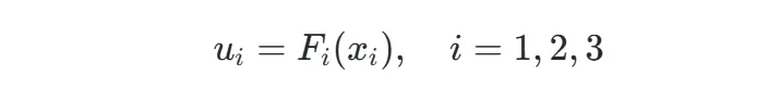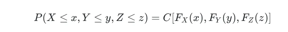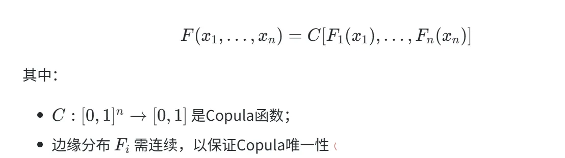 Copula是一种将多变量联合分布函数 F(x1,…,xn) 分解为边缘分布 Fi(xi) 和依赖结构 C 的函数(Sklar定理):
