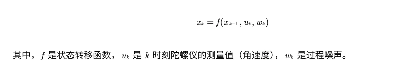 状态方程描述了系统状态随时间的变化,考虑了陀螺仪的测量值和过程噪声。由于陀螺仪测量的是角速度,需要将其积分才能得到姿态变化。常用的积分方法包括一阶积分和四元数积分。四元数积分可以更好地处理较大的角速度变化,避免出现奇点问题。因此,状态方程可以表示为: