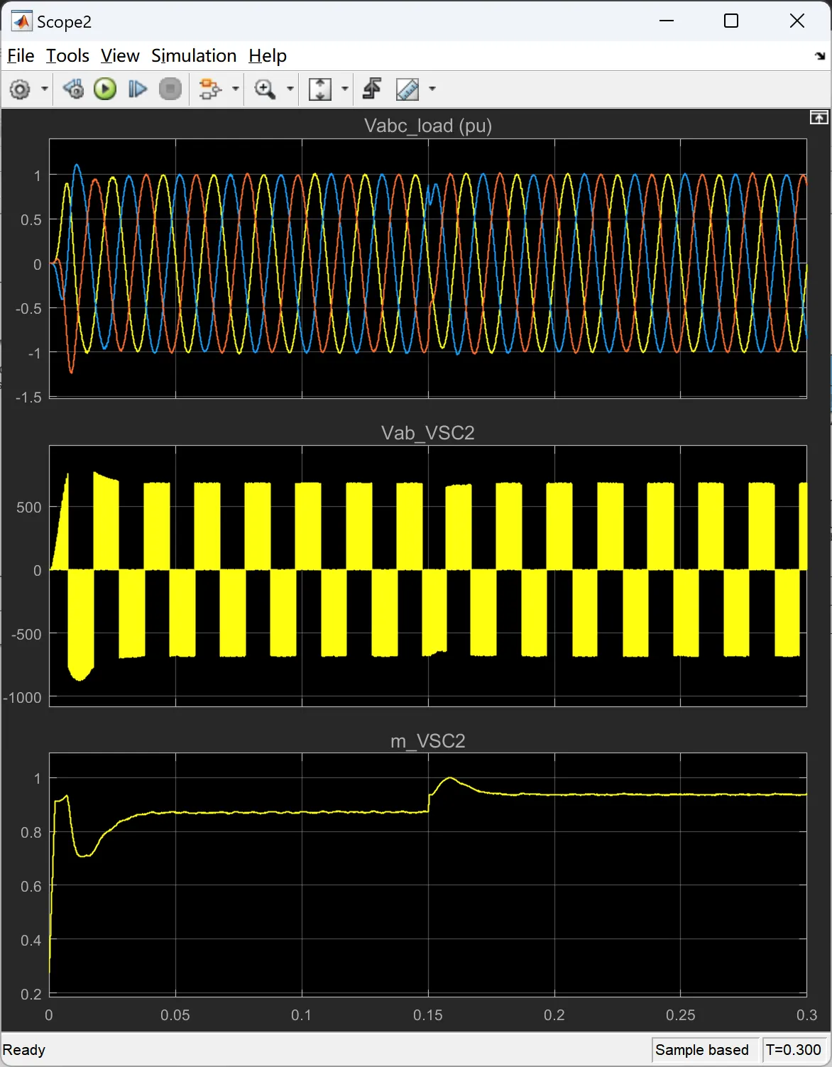 VSC2连接到50赫兹负载,充当逆变器的功能。它输出50赫兹的交流电,并将负载电压调节至380伏特有效值。PWM斩波频率为2000赫兹。