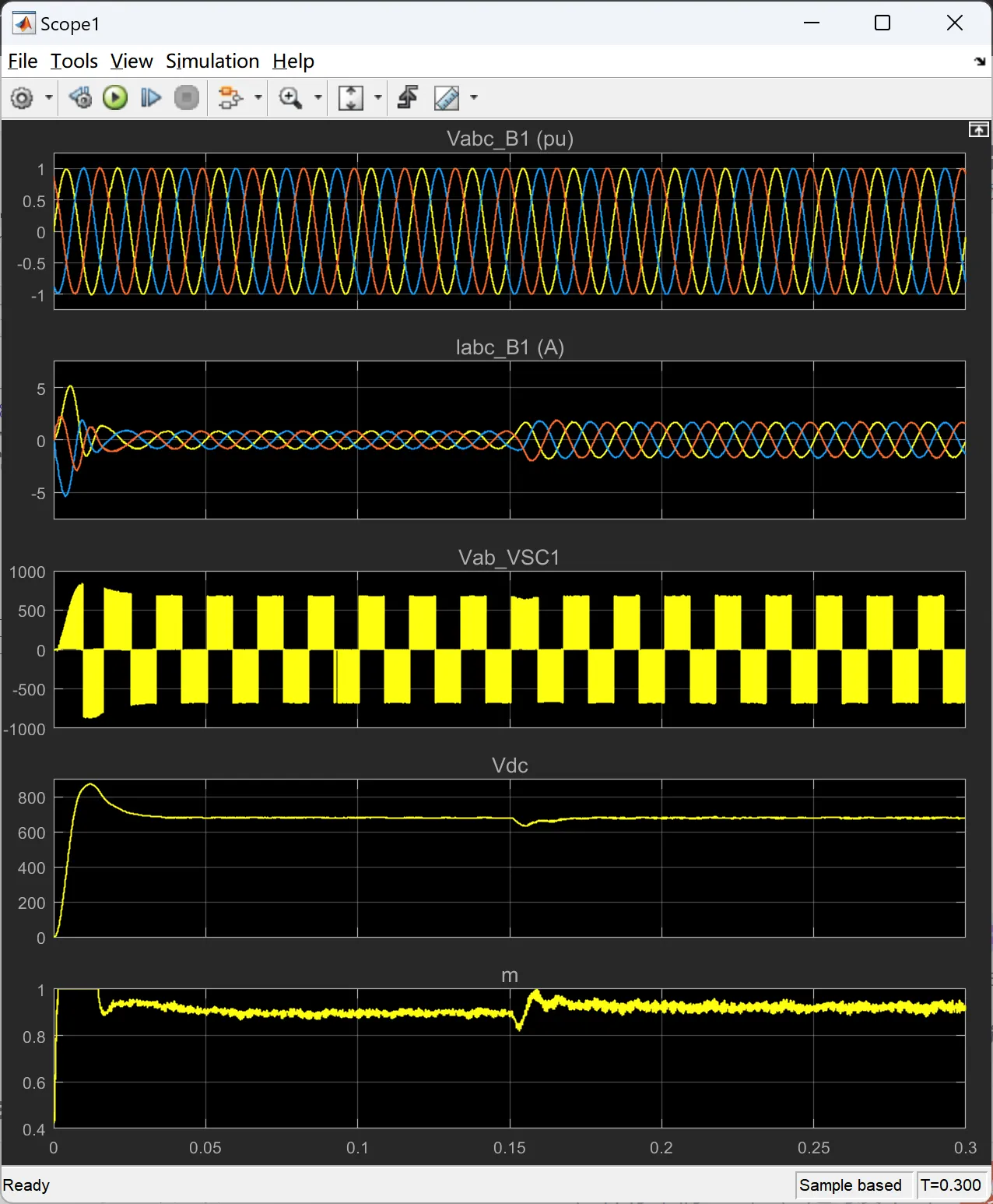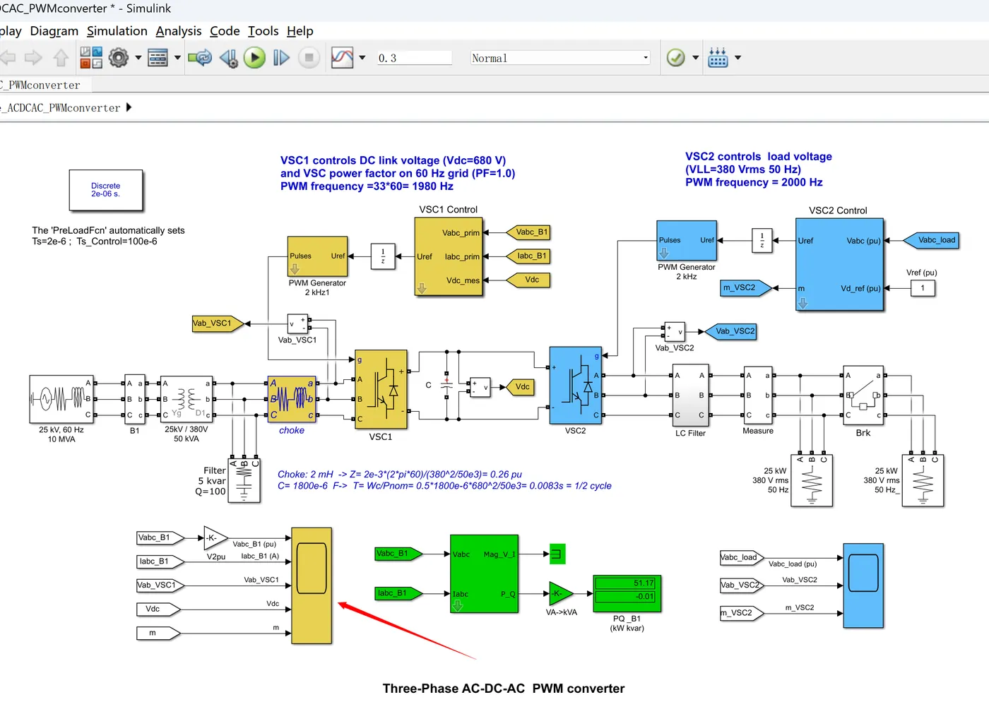 连接到60赫兹电网的VSC1作为整流器运行。它将直流链路电压调节到680伏特,并在交流电网上保持单位功率因数。PWM斩波频率为1980赫兹。