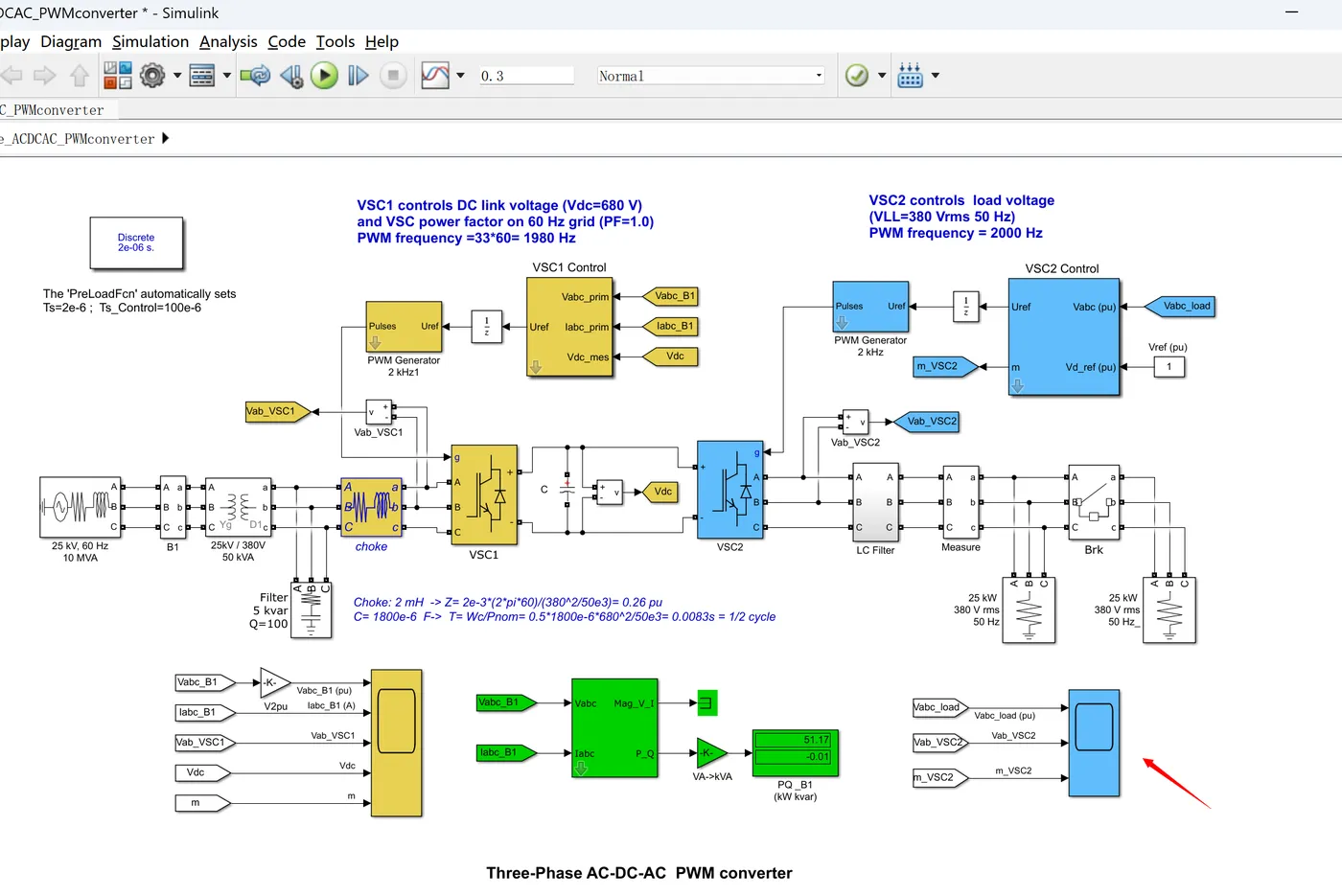 VSC1连接到60赫兹电网,充当整流器的角色。它调节直流链路电压至680伏特,并在接入的交流电网上保持单位功率因数。PWM斩波频率为1980赫兹。