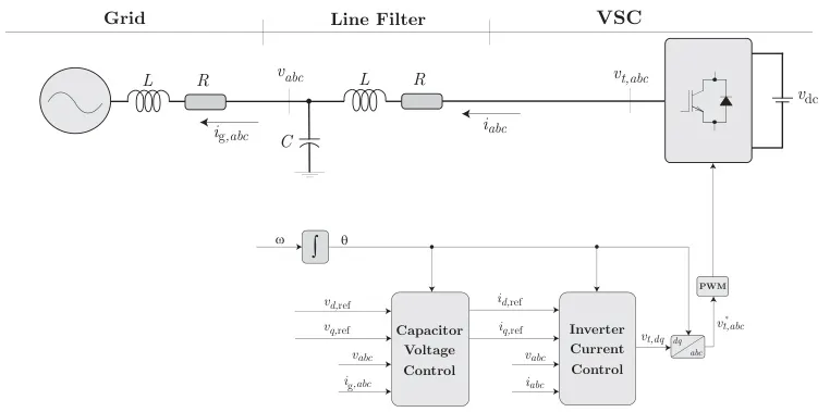 - 整流侧:输入电感(抑制d<i>/d<t>)、直流电容(维持V<sub>dc</sub>稳定);