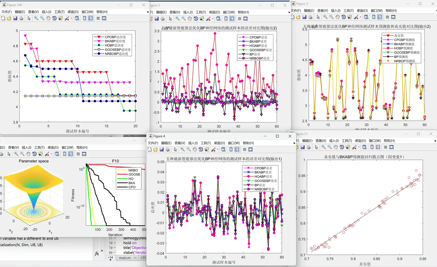 基于BKA、HO、CP、GOOSE、NRBO算法优化BP神经网络的回归预测比较研究