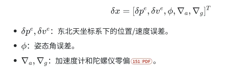 - 状态方程:描述误差传播过程。例如,IMU的加速度计零偏、陀螺仪零偏等误差模型: