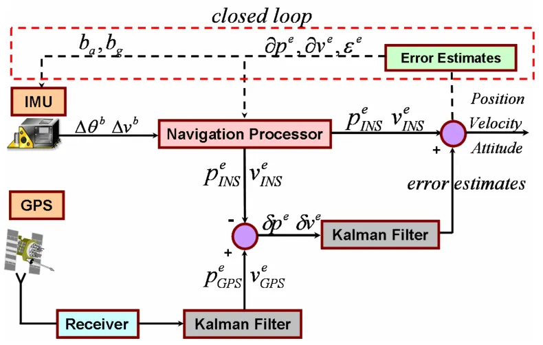 其中,δx为误差状态向量(如位置误差、速度误差、姿态角误差等),F为误差传播矩阵,w为过程噪声。 - 观测方程:建立GPS与IMU输出间的误差关系: