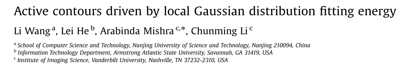- 能量泛函设计:定义局部高斯分布拟合能量,迫使轮廓将不同统计特性的区域分离: