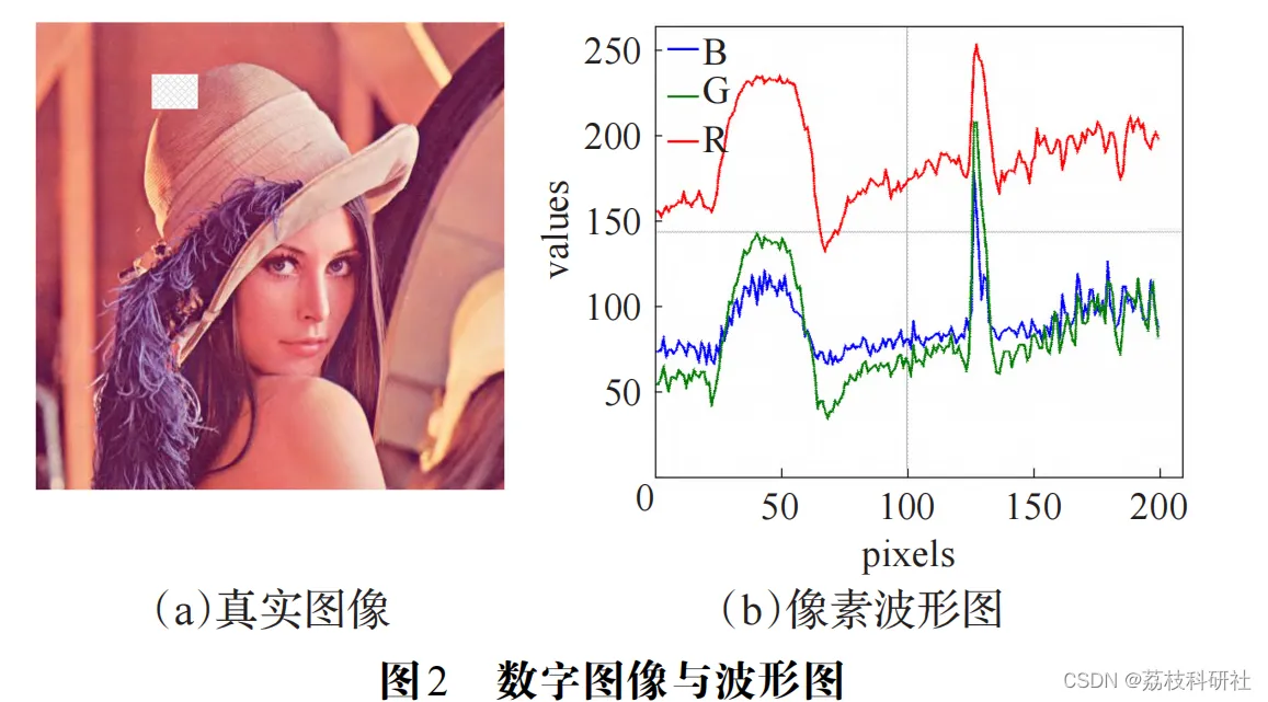 彩色图像中,每一个像素点又包含RGB三个通道,其强度范围都在 0~255 之间。把图像某一行中的所有像素绘制成三条曲线,可以得到由像素强度绘制的波形图,如图2所示。