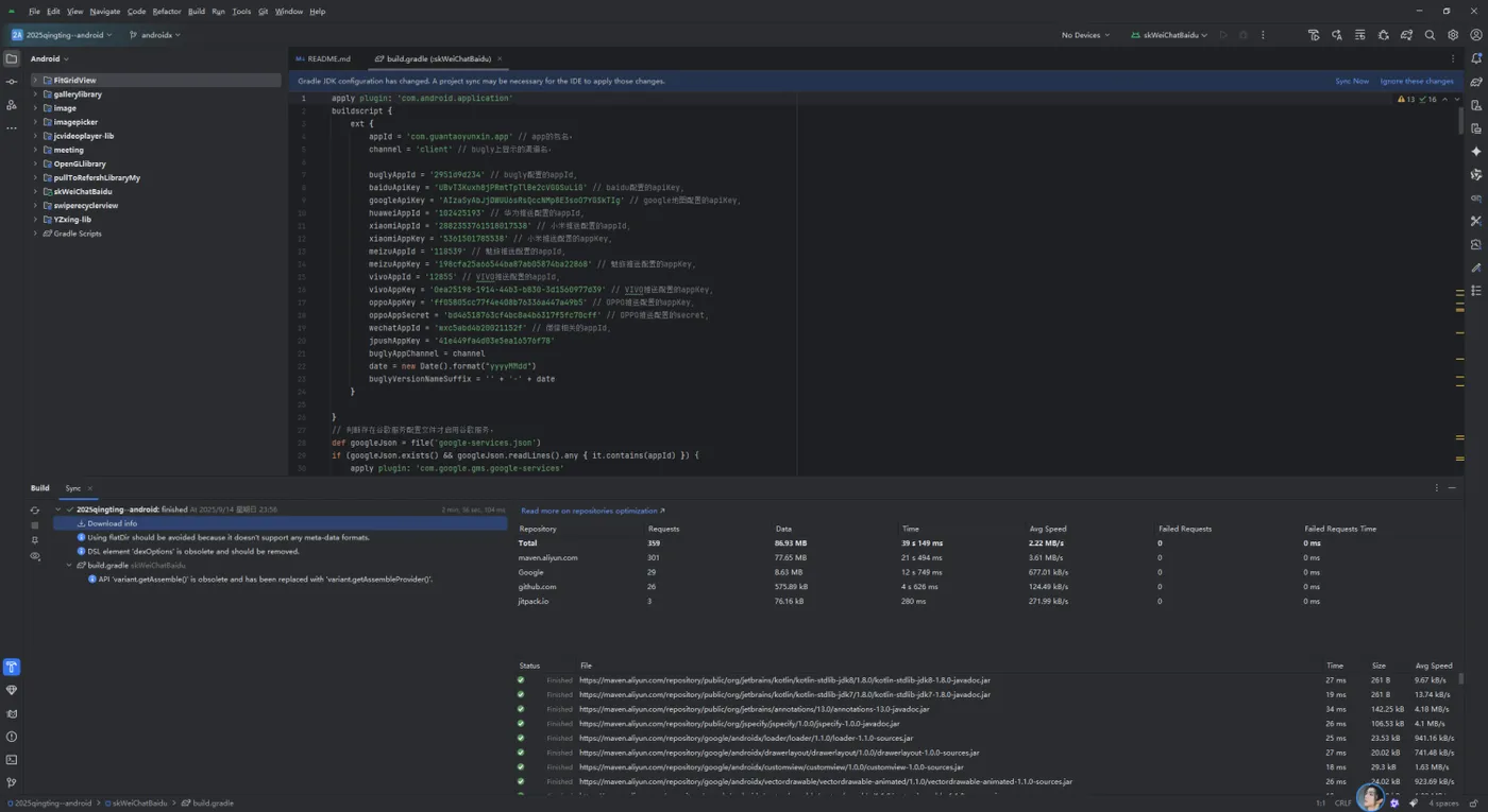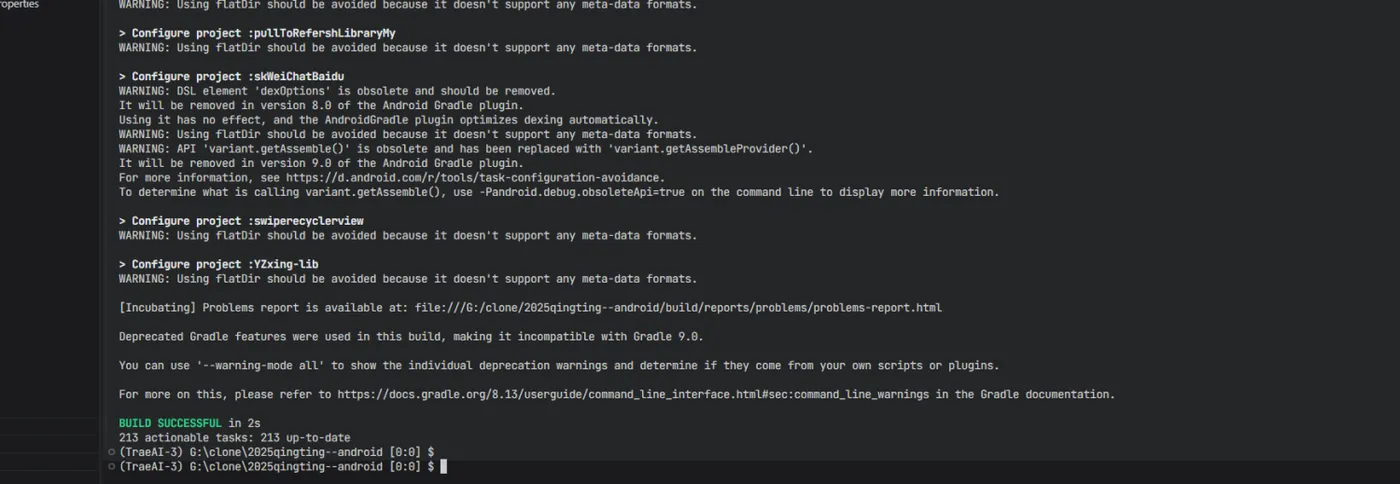 通过运行 ./gradlew :skWeiChatBaidu:assembleDebug 命令,我们确认了项目的调试版本可以正常构建。虽然构建过程中显示了一些警告信息(如flatDir使用、dexOptions已过时等),但这些都是非致命的,不会影响应用的运行。