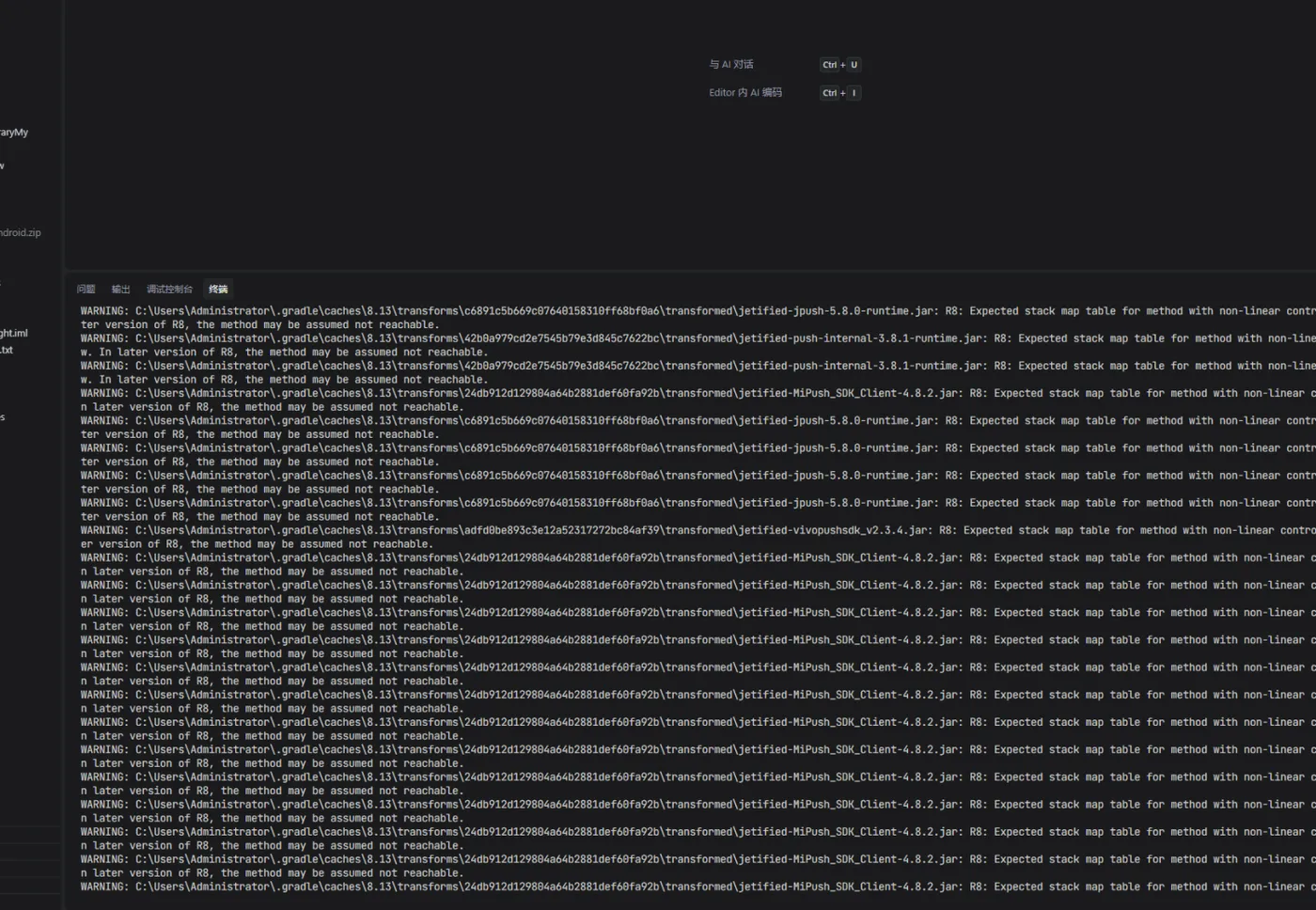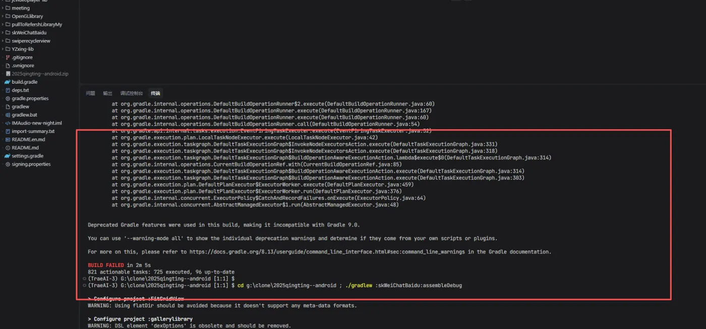 命令执行失败但没有详细错误信息,我将尝试使用—stacktrace参数重新执行构建命令,以获取更详细的错误信息。