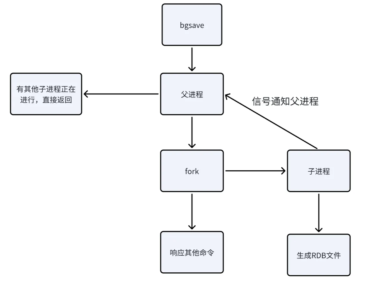 执行bgsave 命令,Redis ⽗进程判断当前进是否存在其他正在执行的子进程。比如现在已经有一个子进程正在执行bgsave了,此时就把当前的bgsave给返回。也就是说,此时redis服务器可能会收到多个客户端发送来的bgsave命令,但只处理一个,其他的都返回。