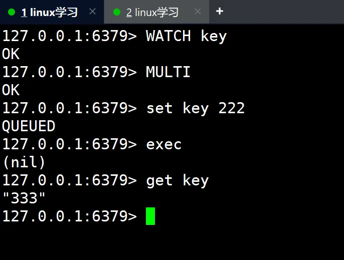 在执行exec后,在执行上述事务中的命令时,发现key在外部有修改,那么在执行set key 222时,就没有真正执行,返回接轨是nil,不是ok。