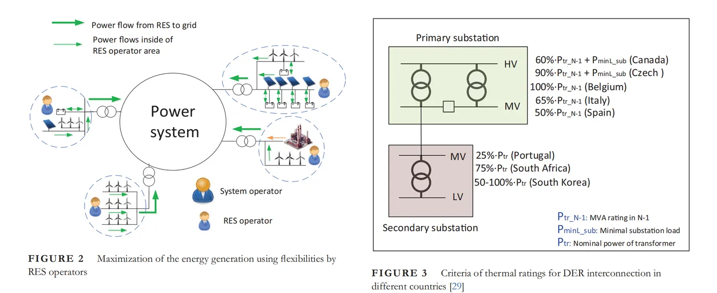 然而,这种变压器规模的方法可能会导致拥挤,例如,如果新RES设施的互连将超过最初计划的RES容量。即使变压器未被规模不足,仍然可能发生拥挤。例如,到2040年,荷兰由于负荷增长和新发电设施的增加,将有近90%的配电变压器将过载[12]。因此,必须在某些时间段内减少一定比例的RES发电量[13]。这导致RES装机容量的低利用率(降低应对气候变化措施的效率)和/或更换变压器的高成本。然而,现代的主动网络运营策略[12, 14–18]意味着利用来自发电、储能和负荷的灵活性[19],可以最大程度地减少RES的减量以及变压器拥挤。因此,如果应用灵活性,新的RES设施可以与“拥挤”的变压器互连。因此,现代电力系统在特定背景下运行:RES整合、新的变压器规模和主动运营策略(灵活性)等。