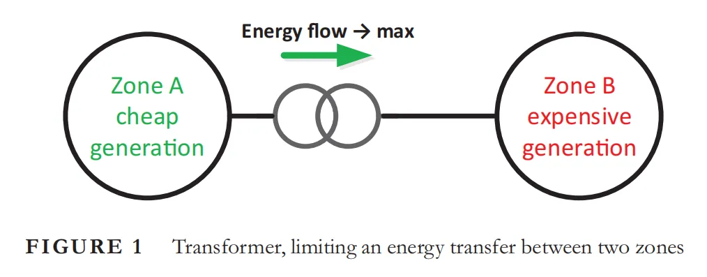 能量极限应用的兴趣可以在变压器是限制性元素的问题中找到。例如[23],报告称,位于PJM西部和MISO东部的发电能力受到变压器的限制,无法为PJM运行区域提供负荷。具体来说,Cloverdale变压器被认为是PJM前25个约束之一[24]。2018年Cloverdale变压器的拥挤成本达到了8750万美元,占PJM总拥挤成本的6.7%[24]。与国内运行区域一样,变压器可以减少国家之间的互连容量,就像在欧洲发生的情况[25]。这种变压器拥挤会影响跨境交流和电力系统的发电调度。这对系统运营商非常重要,因为调度解决方案对发电成本有很大影响。例如,FERC估计,全球调度解决方案的改善可以每年节省870亿美元[26]。在国家或国