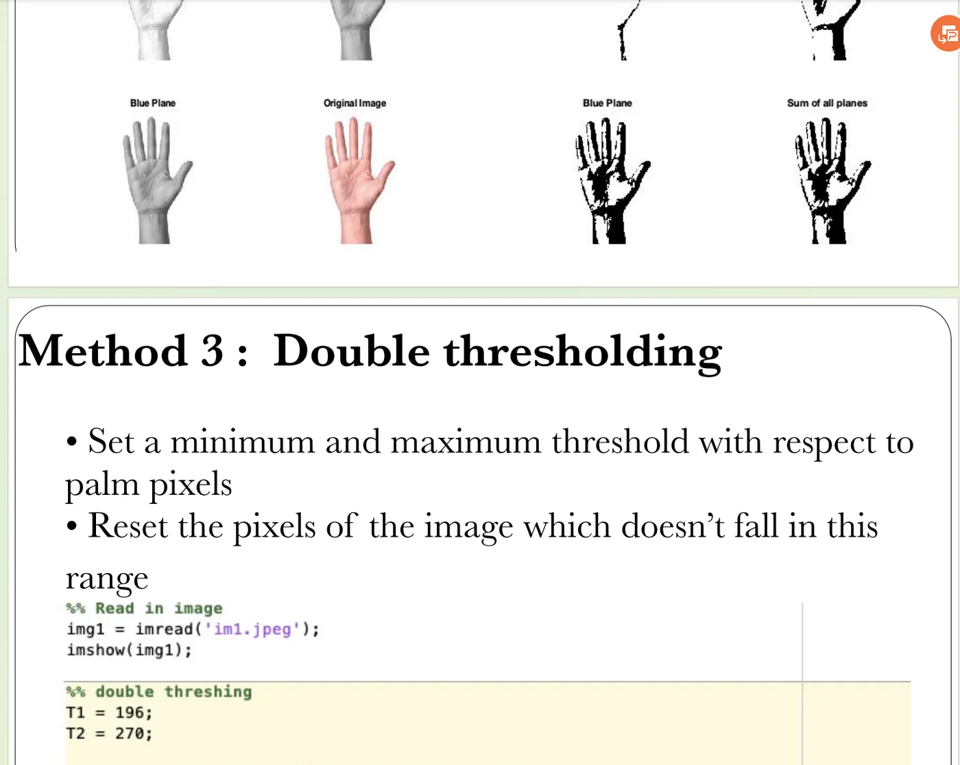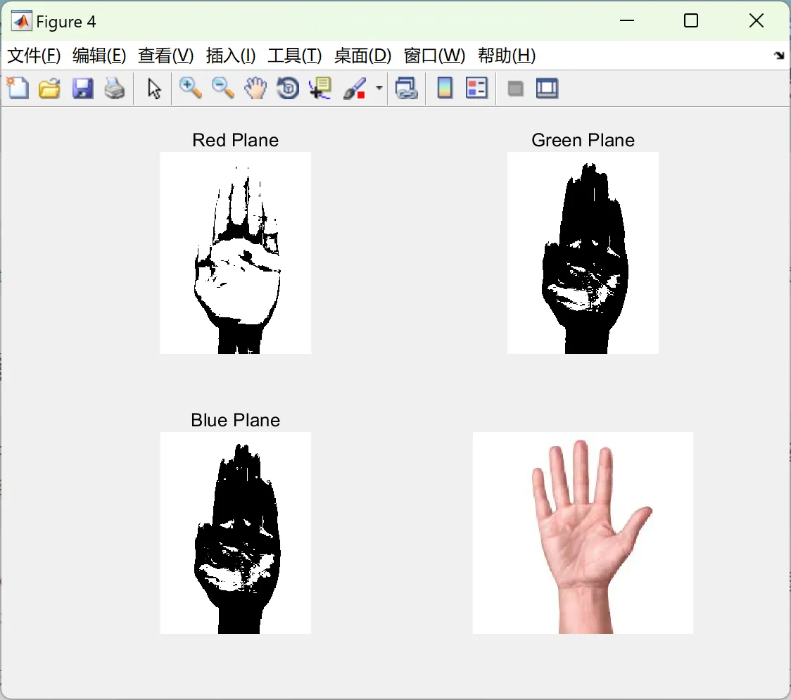 %% Read in image img1 = imread('im1.jpeg'); imshow(img1); %% RGB Color Space img = img1; Rmatrix = img(:,:,1); Gmatrix = img(:,:,2); Bmatrix = img(:,:,3); figure; subplot(2,2,1) , imshow(Rmatrix); title('Red Plane'); subplot(2,2,2) , imshow(Gmatrix); title('Green Plane'); subplot(2,2,3) , imshow(Bmatrix); title('Blue Plane'); subplot(2,2,4) , imshow(img); title('Original Image'); %% levelR = 0.62; levelG = 0.65; levelB = 0.7; redImg = im2bw(Rmatrix,levelR); greenImg = im2bw(Gmatrix,levelG); blueImg = im2bw(Bmatrix,levelB); SumImg = (redImg & greenImg & blueImg); % Plot the data subplot(2,2,1), imshow(redImg); title('Red Plane'); subplot(2,2,2), imshow(greenImg); title('Green Plane'); subplot(2,2,3), imshow(blueImg); title('Blue Plane'); subplot(2,2,4), imshow(SumImg); title('Sum of all planes'); %% Complement image and Fill in holes
