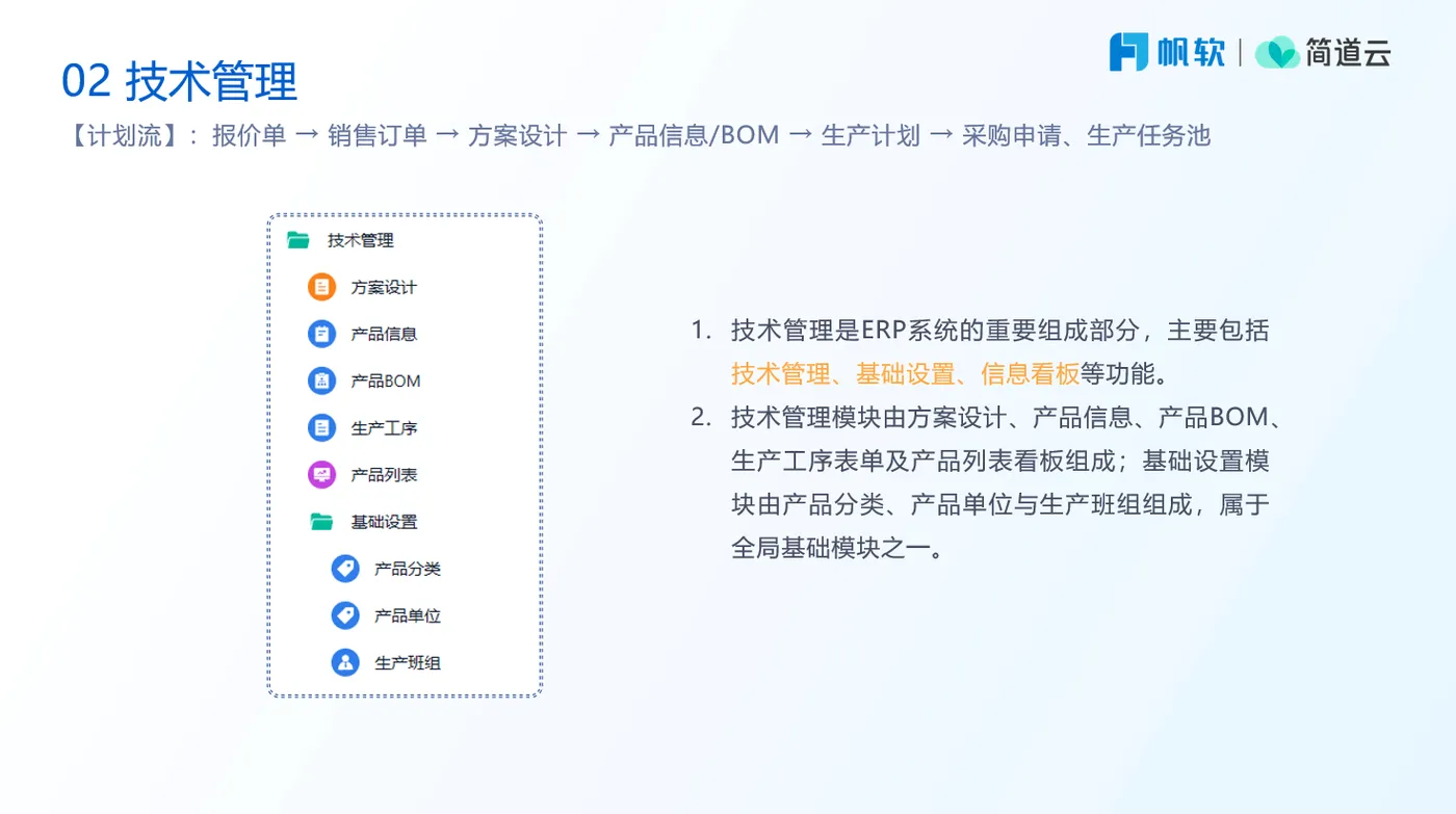 - 技术管理服务是核心,分解为产品信息、BOM、工序、变更模块。
