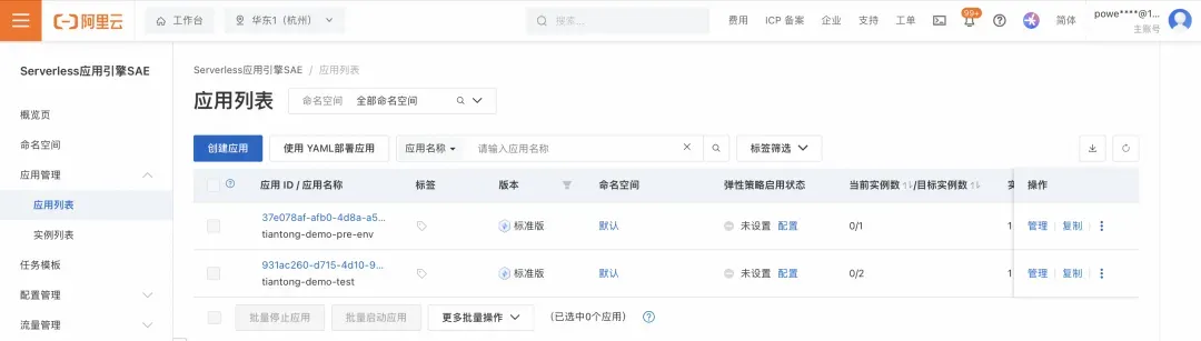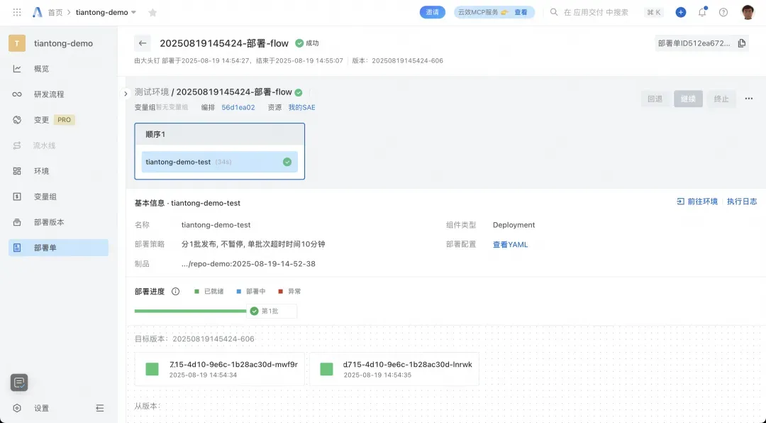 一切配置完成后,直接运行研发流程,就可以完成镜像的构建和部署,AppStack 部署任务会专门创建「部署单」,通过部署单可以查看部署过程的进度和问题。部署成功以后,在 SAE 就可以看到成功创建了应用,SAE 应用的名称和 AppStack 配置的 deployment 的名称完全对应,一个 AppStack 应用会根据不同的环境,创建多个 SAE 应用。