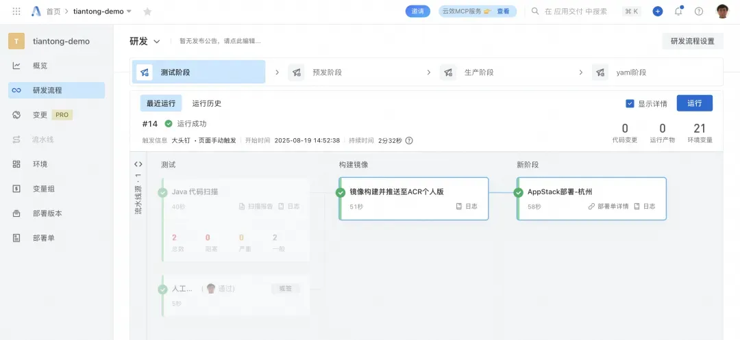- 在效率方面,云效 AppStack 通过可复用的应用模板和参数化的部署编排,统一管理开发、测试、生产等多环境配置,研发人员只需专注业务代码,大幅减少了重复的运维配置工作。