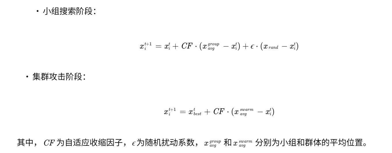 - 小组搜索:2-5只个体组成协作小组,通过计算小组平均位置与随机个体的差异生成新解,增强局部探索能力。