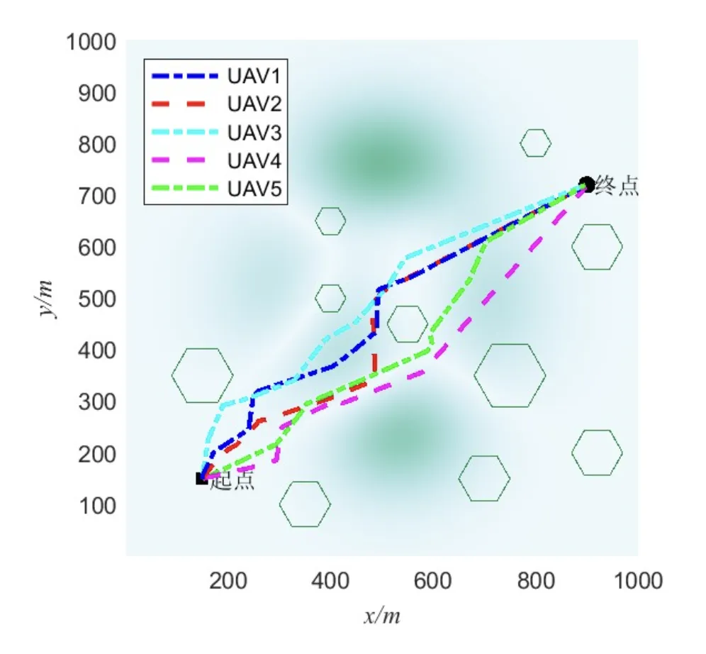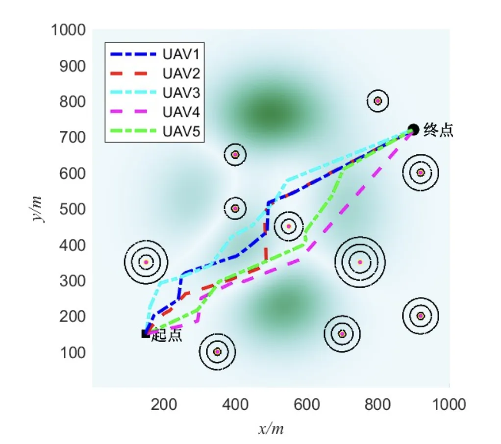 在地震灾区,5架无人机需从基地出发,分别向5个救援点运送物资。通过RBMO算法规划的路径成功避开倒塌建筑和余震区域,任务完成时间较人工规划缩短37%。